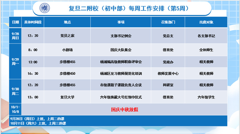 2025学年第一学期复旦二附校(中学部)第5周工作安排