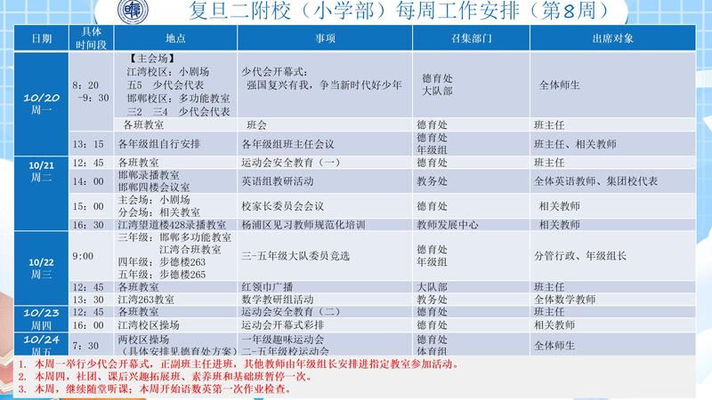 2025学年第一学期复旦二附校(小学部)第8周工作安排