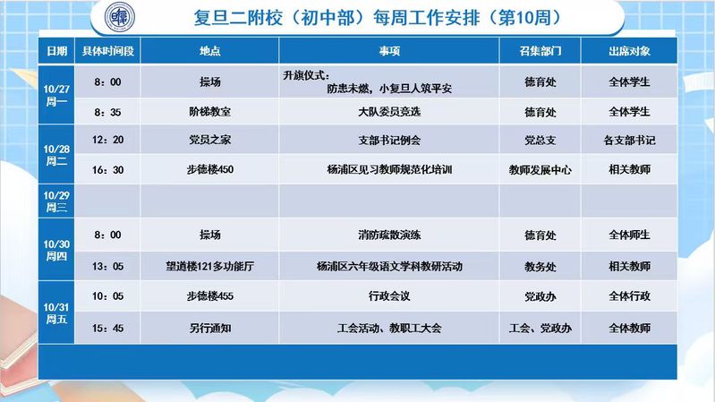 2025学年第一学期复旦二附校(中学部)第10周工作安排