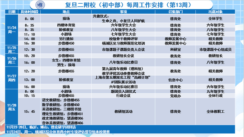2025学年第一学期复旦二附校(中学部)第13周工作安排