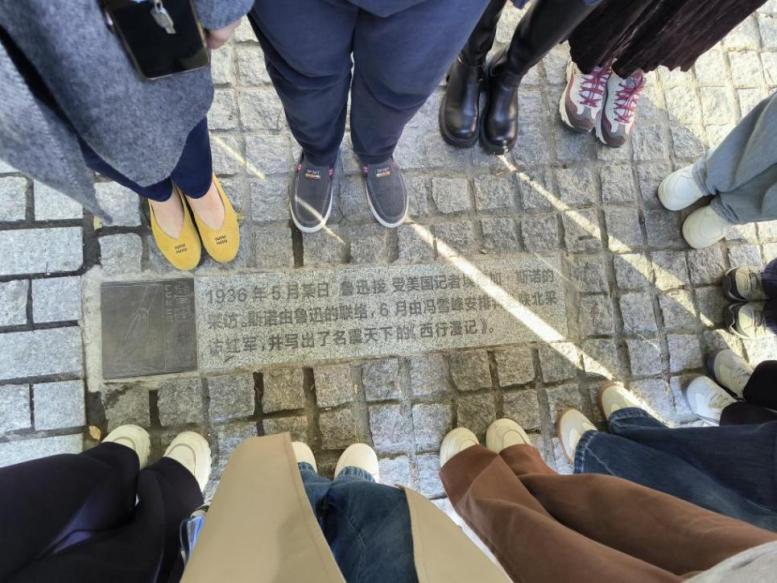 午后微光中,教师们集体乘车抵达鲁迅故居,沿历史足迹依次走访鲁迅故居、内山书店旧址等文化地标。作为中国现代文学的奠基人、左翼文化运动的重要旗手,鲁迅先生在上海度过了他生命中最后的十年,留下了丰富的精神遗产。他的多篇作品入选语文教材,贯穿各学段,是整本书阅读与思政融合教学的重要载体。在鲁迅故居的木门旧窗前,大家凝神驻足,仿佛看见先生伏案疾书的坚毅身影;在内山书店复原场景中,深切体悟那段文化坚守与思想激荡的岁月,感受鲁迅精神在时代长河中绽放的光芒。