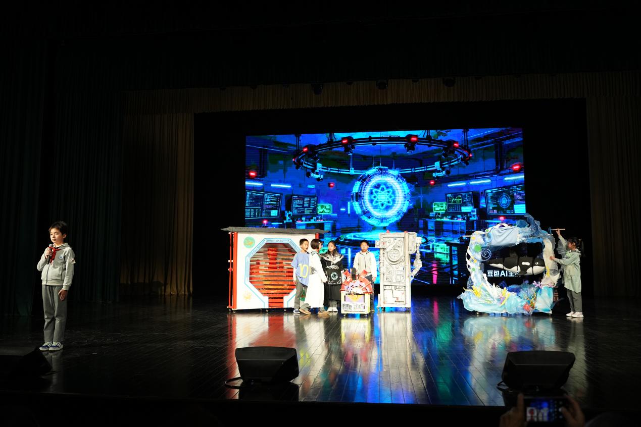 随后,同学们带来了精彩的科技剧目展演。小学部表演的《超能蜕变:光明与黑暗的起源》,以戏剧形式引发了同学们对科技发展伦理的思考;初中部呈现的情景剧《搭搭运动,一拍即合!》,生动展现了智能科技如何助力健康生活。两场表演虽主题各异,却共同彰显了科技的人文关怀与实践价值。