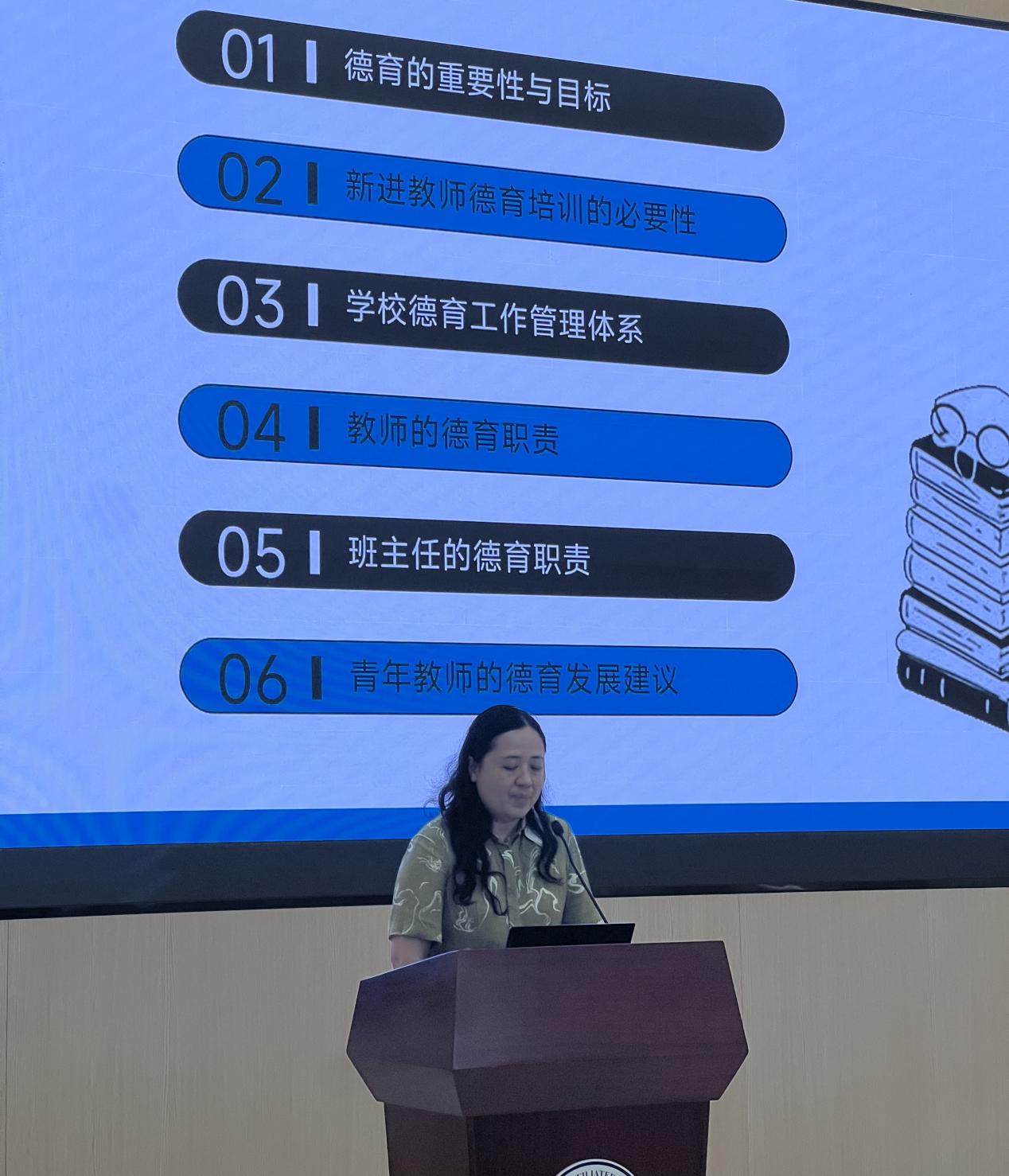 德育处主任杨洁老师全面介绍了学校德育工作与全员导师制度。她强调德育是教育的灵魂,应贯穿教育教学全过程,培养学生爱党爱国、坚定“四个自信”,并养成良好的品德与社会责任感。全员导师制要求每位教师与学生结对,通过谈心、家访、书面反馈等方式与班主任协同育人。杨老师建议新进教师加强德育理论与心理学知识的学习,积极践行“教人做人”的教育使命。