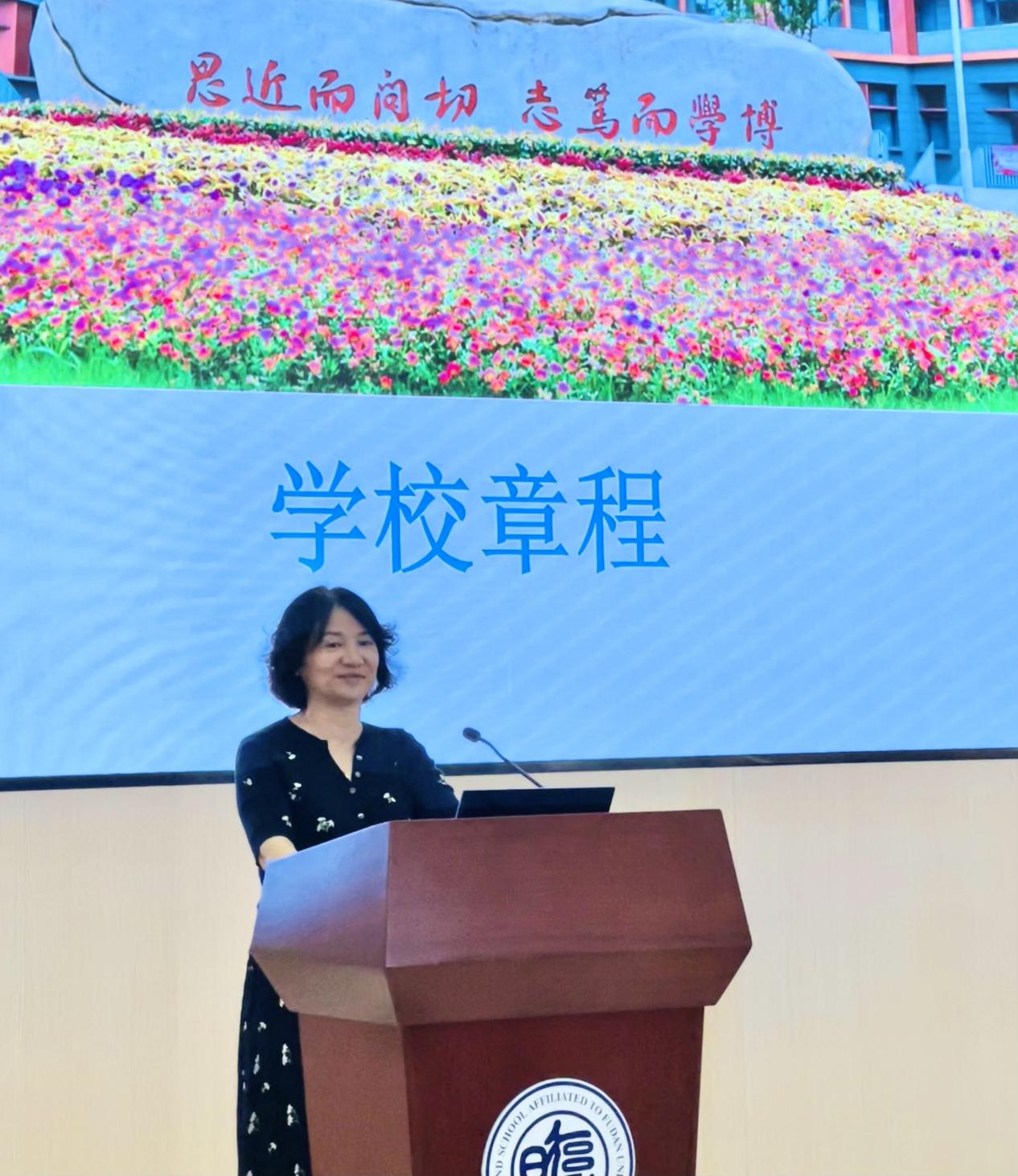 瞿丽红书记首先对三个学校的章程进行了系统解读,围绕章程序言及九章核心内容,明确了学校作为政府与复旦大学共建校的办学性质与“更宽广”的教育理念,强调“价值引领、人文筑基、素养赋能、科创启智”的培养方向。瞿书记特别指出,党组织在学校重大决策中发挥全面领导作用,校长依法履职,教代会保障民主管理。她还回顾了复旦二附校自2019年合并以来的快速发展,并勉励新进教师以教育家精神为引领,严守规章、关爱学生,共同推动学校高质量发展。