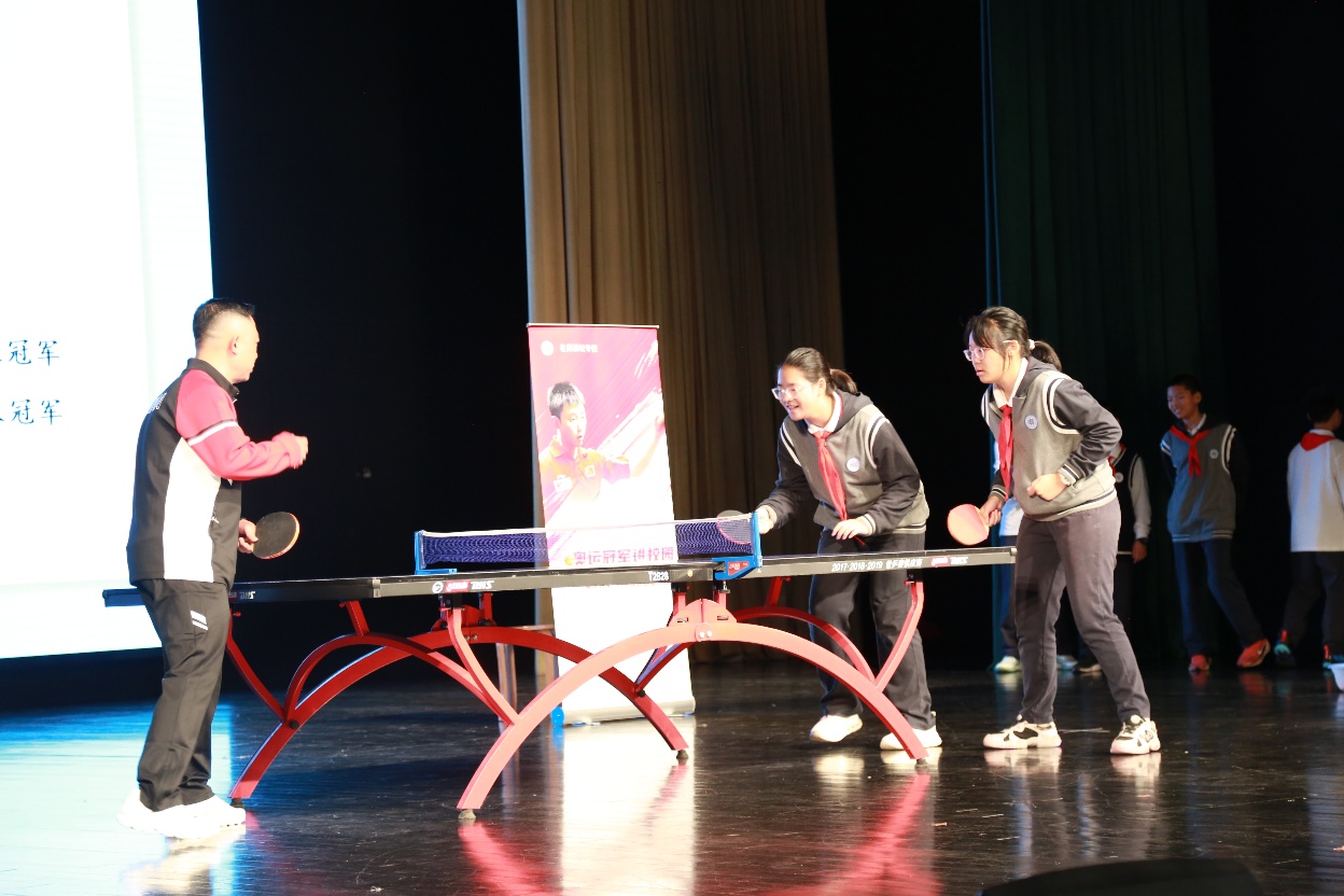 演讲结束后,阎森拿起球拍与同学们亲切互动、切磋球技。他将精湛的技艺融入每一次挥拍,用行动生动诠释了何谓专注与坚持,瞬间点燃了全场的热情,引来阵阵掌声与欢呼。