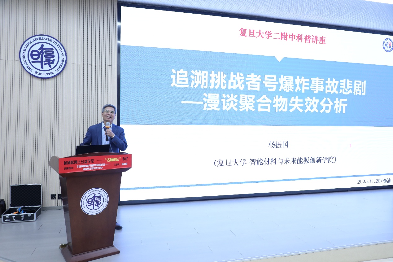 为丰富校园科技教育内容,拓宽师生科学视野,培育严谨务实的探究精神,2025年11月20日下午,复旦大学第二附属学校在阶梯教室成功举办专题学术讲座。本次讲座特邀复旦大学二级教授、博士生导师杨振国先生主讲,讲座以《追溯挑战者号爆炸事故的悲剧——漫谈聚合物失效分析》为题,为六年级师生带来了一场兼具学术深度与科普温度的科学盛宴。