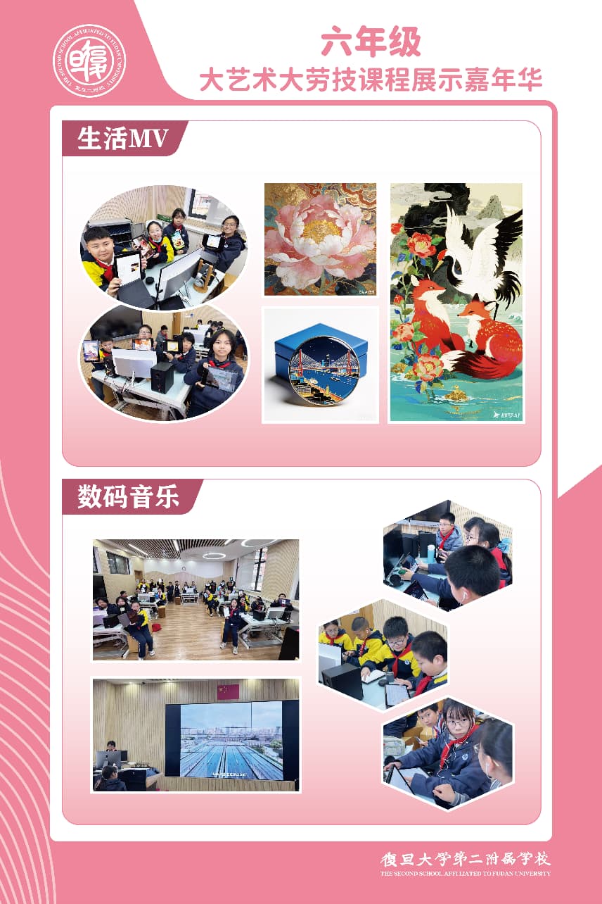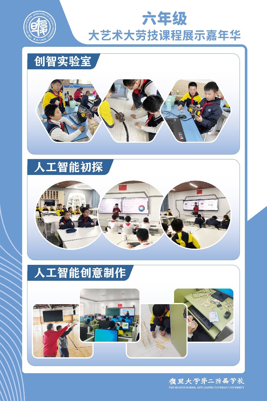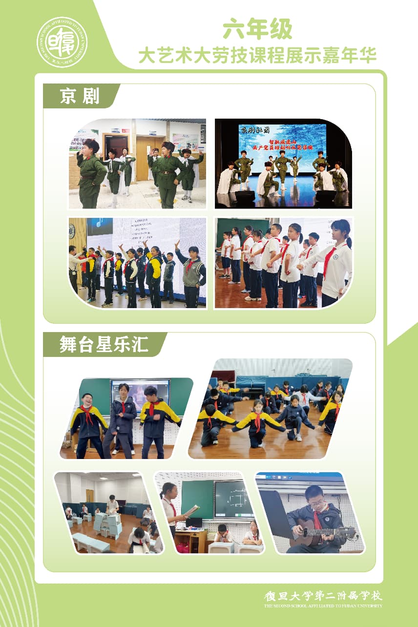 这场融合视觉、触觉与听觉的多元展示,既是对一学期“大艺术·大劳技”融合课程的总结,更彰显出美育劳育协同育人的独特魅力。美不在远方,就在每一次专注的刻刀下、每一笔沉稳的书写中、每一段婉转的唱腔里。愿每一位小复旦人始终葆有实践的热情与审美的自觉,在创造中认识美,在劳作中体味真,让艺术与劳动共同滋养生命的底色,迈向更开阔的成长之路。
