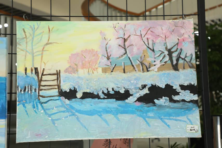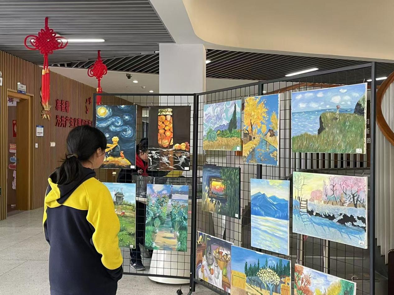 展厅中,视觉艺术类作品展现出多元表达:篆刻方寸之间金石有声,朱红印蜕跃然纸上;书法笔墨沉稳,楷书端庄、行书流畅,在横竖撇捺间修心养性;国画以简约笔墨绘山水花鸟,初显东方美学意趣;油画大胆运用色彩与光影,讲述校园故事或内心幻想;版画以刀代笔,在黑白肌理中展现巧思与秩序。