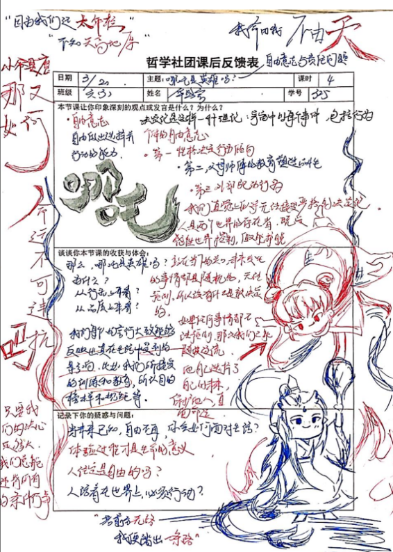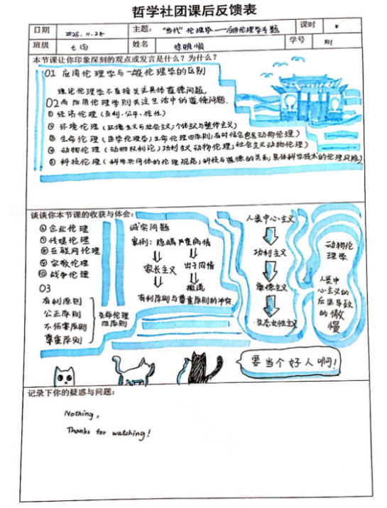 这些思考也悄然映照进他们的日常,同学们学着在寻常处看到哲学的奥妙,感悟“一叶落知天下秋”的智慧;也从更高远宽广的视角来看待生活,体验“会当凌绝顶”的豁达。