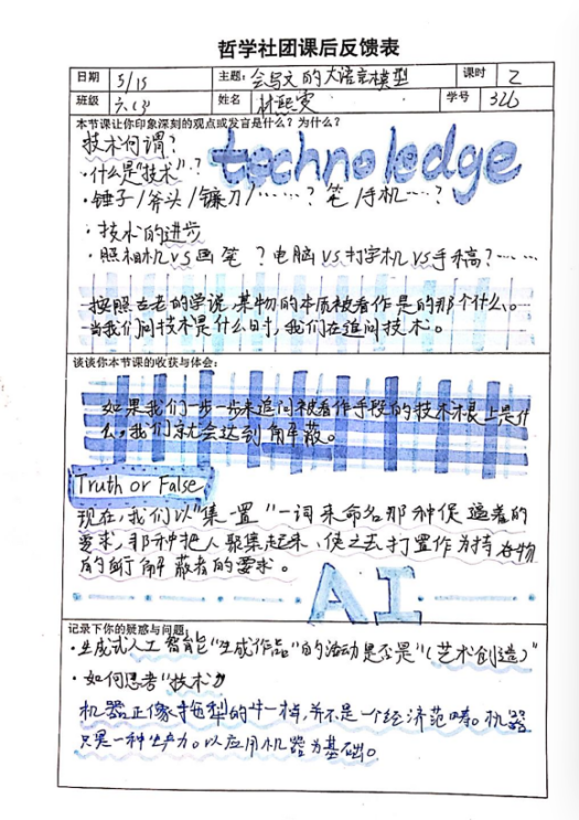 他们在激烈的讨论中,见识多元千面的世界。马安雅同学说:“电车难题的讨论最令我着迷!它让我明白,生活中往往没有完美答案,但思考能让我们更接近理性。”孙可可同学对“什么是月饼”的讨论印象深刻,原本习以为常的名称,突然成了值得推敲的哲学问题。而通过“快乐箱”思想实验,魏辰灏同学对“什么是好的生活”有了新的理解。