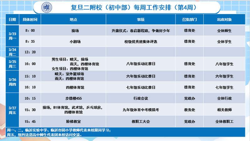 2025学年第二学期复旦二附校(中学部)第4周工作安排