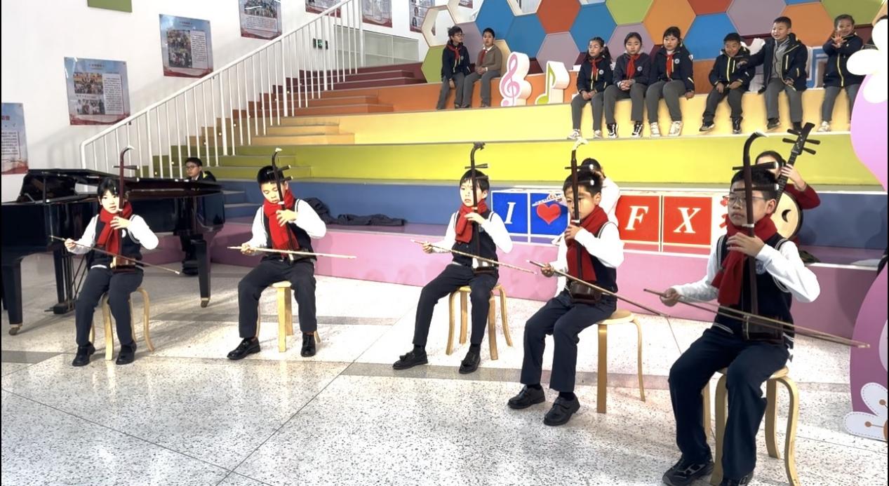 压轴登场的二胡合奏《赛马》节奏铿锵、气势昂扬。五位小演员分别是五2班龙弈尘、五4班林国正、五6班范天骐、四4班张振允、四5班王伊奈。同学们技艺娴熟、配合默契,奔放的旋律尽显马年奋进争先的蓬勃朝气,马蹄声声催人奋进,将现场气氛推向高潮,赢得师生阵阵喝彩。