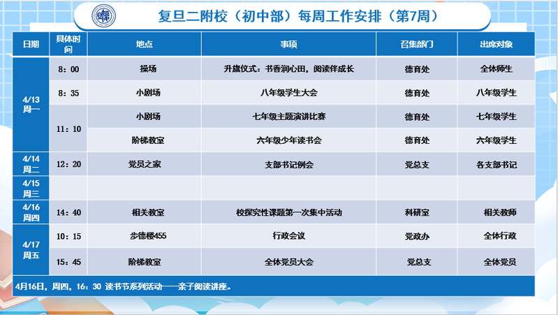 2025学年第二学期复旦二附校(初中部)第7周工作安排